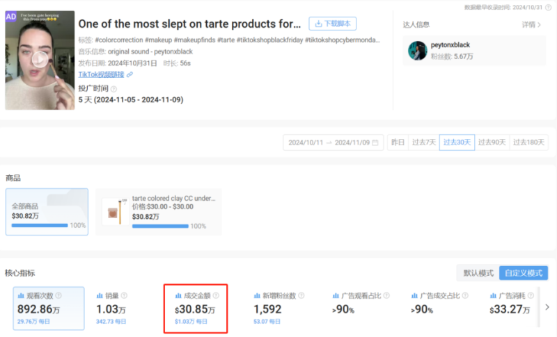 根據Kalodata的數據,在過去10天,TikTok博主@peytonxblack用一條不到一分鐘的視頻,將一款小小的遮瑕膏帶出30.85萬美金的銷售額。在這條視頻中,該博主簡單展示了使用遮瑕前后的效果對比,非常真實,目前視頻播放量已超過890萬次。