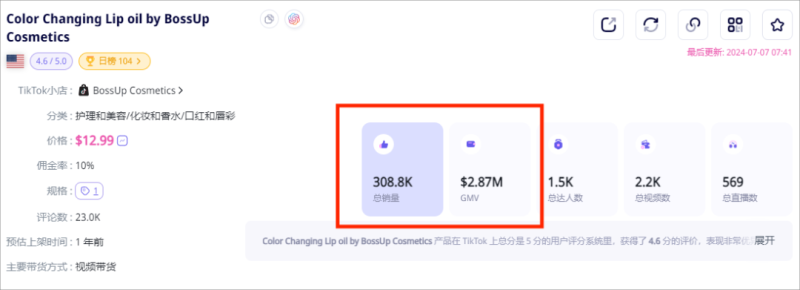 不難發現,美妝類目在TikTok紅得發紫,不少唇釉、眼線筆等產品接連爆單。比如此前一款變色唇釉自去年6月上架以來,銷量一直保持高位,單日最高突破1800單,目前總銷量已經超30萬,預估總銷售額突破280萬美金。