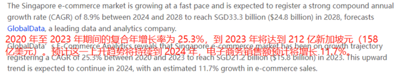 并且在未來(lái)幾年,新加坡電商市場(chǎng)還會(huì)不斷增長(zhǎng)。預(yù)計(jì)在2024—2028年期間,這一市場(chǎng)的復(fù)合年增長(zhǎng)率為8.9%。到了2028年時(shí),它的規(guī)模預(yù)計(jì)將會(huì)達(dá)到333億新加坡元(約合248億美元),還是比較驚人的。