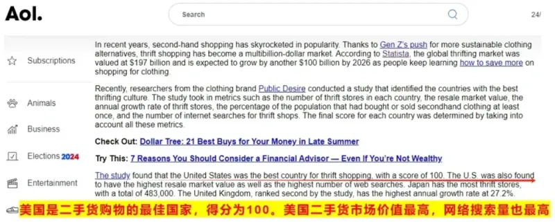 此前服裝品牌Pubic Desire的一項研究顯示,美國擁有28849個二手店,市場價值達到390億美元,這使其成為二手市場價值和網(wǎng)絡搜索量最高的市場;英國位居第二,年增長率最高,達27.2%;日本擁有的二手店鋪數(shù)量最多,達到483000家。