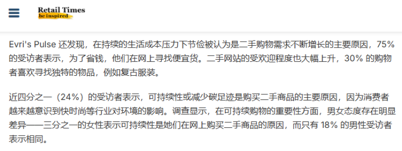 消費者熱衷購買二手商品,這使二手平臺的包裹數(shù)量同比增長了160%。值得一提的是,消費者不僅僅是為了省錢(75%),還有約30%的人喜歡尋找復古服裝等獨一無二的商品,以及有24%的人是秉承環(huán)保理念,希望減少碳足跡。