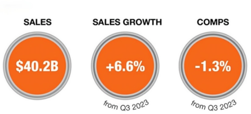 今日,美國家居零售巨頭家得寶(Home Depot)公布了2024年第三季度財報。據財報顯示,家得寶第三季度銷售額為402.17億美元,較2023財年第三季度增長6.6%;總體的同店可比銷售額下降1.3%,美國門店的同店銷售額下降1.2%;凈收益為36.48億美元,相比去年同期的38.1億美元有所下降。