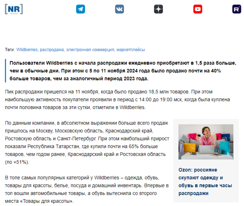 11月16日消息,俄羅斯電商平臺Wildberries公布雙11大促數(shù)據(jù)。Wildberries透露,自11月促銷開始以來,用戶的購買量已是平時的1.5倍。特別是在11月5日-11日期間,商品銷量比2023年同期增加了近40%,11月11日當(dāng)天更是創(chuàng)下了銷售峰值,售出1850萬件商品。買家活躍度在14:00-19:00期間最高,幾乎一半的商品均在這個時段內(nèi)成交。