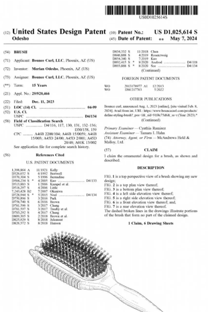而為了維護產品的獨特競爭力,早在2023年年底,Bounce Curl就為EdgeLift梳子申請了外觀專利,今年5月正式下證,專利號為USD1025614S。