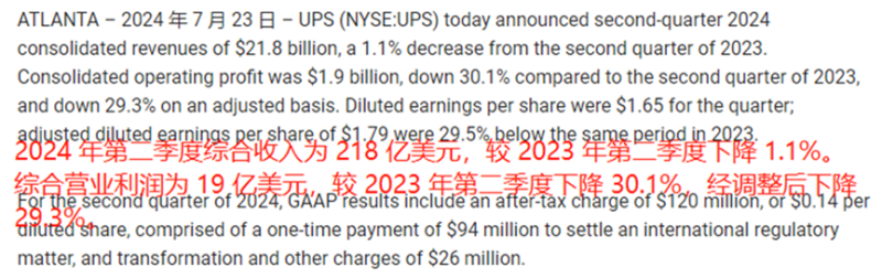 UPS(聯(lián)合包裹)今年以來的業(yè)績表現(xiàn)也不太樂觀。財(cái)報(bào)顯示,2024年第二季度UPS綜合收入為218億美元,同比下降了1.1%;綜合營業(yè)利潤跌得更加明顯,同比下降了30.1%,金額為19億美元。