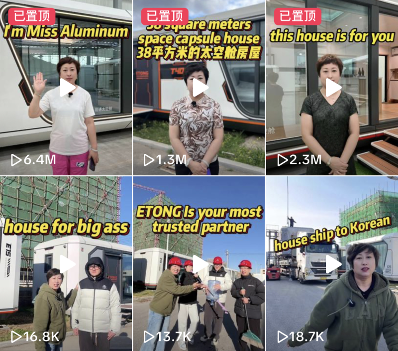 例如在TikTok賣太空艙的工廠。在他們的宣傳視頻中,一位東北大姐長期出鏡作為介紹人,操著一口極具東北風(fēng)味的中式英語,給海外網(wǎng)友展示太空艙產(chǎn)品。從今年8月初發(fā)布至今,這家賣太空艙的工廠賬號視頻已經(jīng)收獲數(shù)百萬次播放,點贊數(shù)也突破140萬。