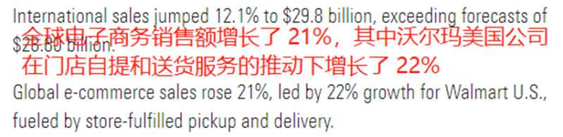 財報數據顯示,今年第一季度,受到線下門店自提和送貨服務的推動,沃爾瑪美國電商銷售額同比增長了22%,全球電商銷售額也增長了21%。到了第二季度,沃爾瑪電商業(yè)務繼續(xù)增長,全球電商銷售額同比增長了21%,增速還是十分不錯的。