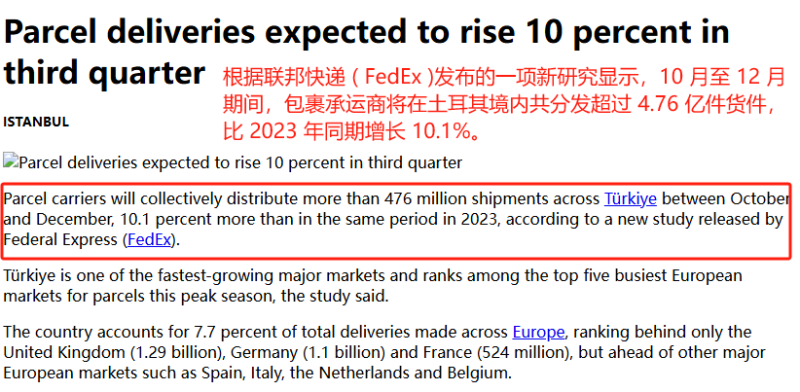 作為一個橫跨亞歐大陸的國家,土耳其在電商發展成熟的歐洲地區也毫不遜色。研究指出,土耳其旺季包裹遞送量僅次于英國(13億件)、德國(11億件)和法國(5.24億件)等,這使其成為增長最快的主要市場之一,也是本次旺季歐洲包裹運輸最繁忙的五大市場之一。