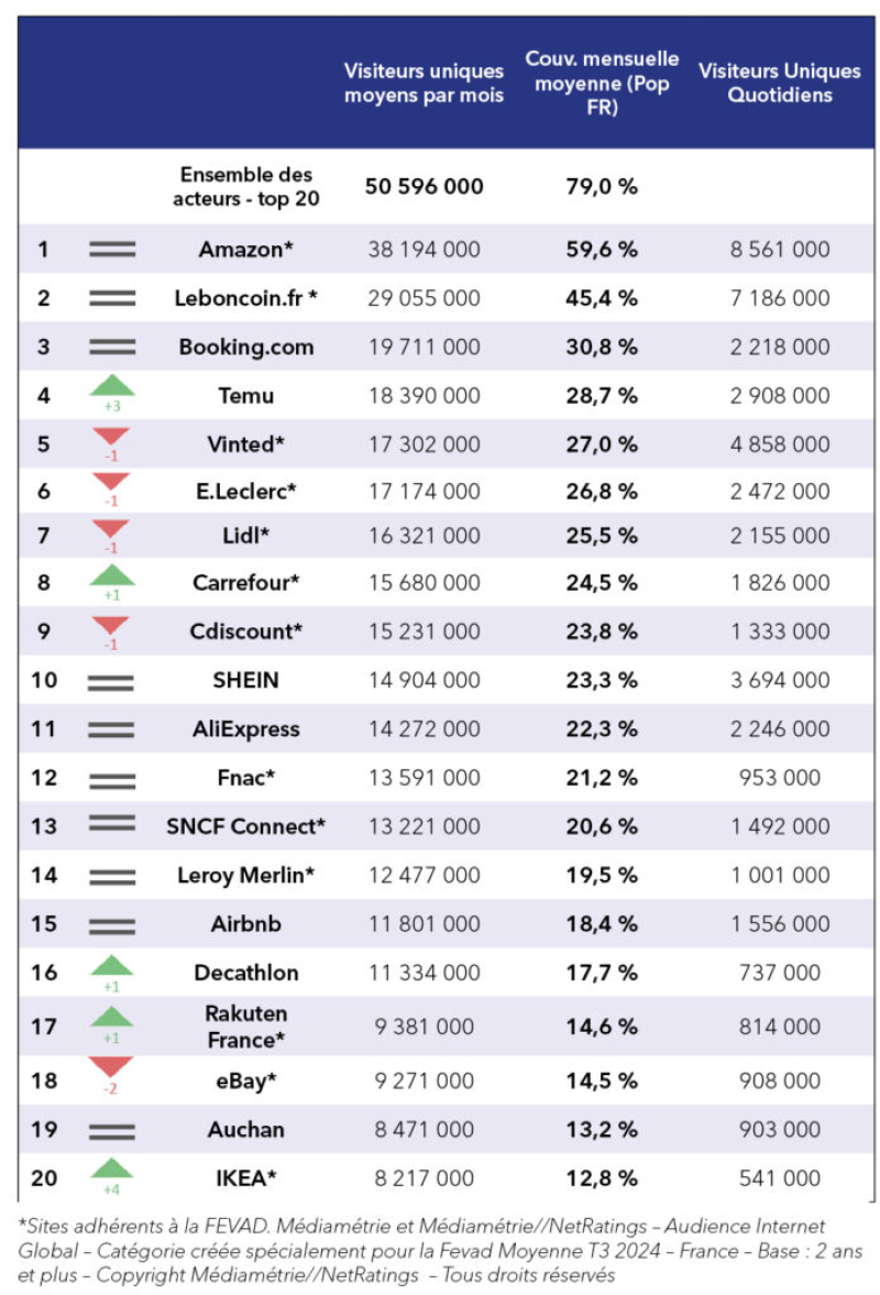 近日,法國電商銷售聯(lián)合會(Fevad)發(fā)布2024年第三季度電商網(wǎng)站排名,Temu成功躋身前5強,位列第四,僅次于亞馬遜、LeBonCoin和Booking。