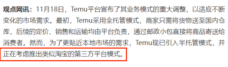 Temu推出平臺模式 圖源:觀點網(wǎng)