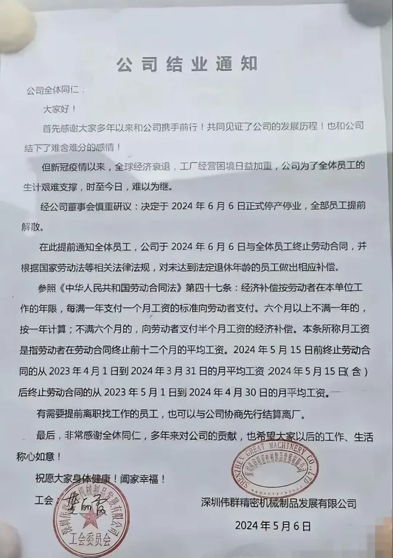 比如今年6月,深圳偉群精密機械制品發展有限公司發布公告,宣布正式停產停業,所有員工都被提前遣散。這家成立于1993年的港資外貿工廠,主營機械及零部件、刀具、工藝制品等業務,早年也是在外貿界混得風生水起。