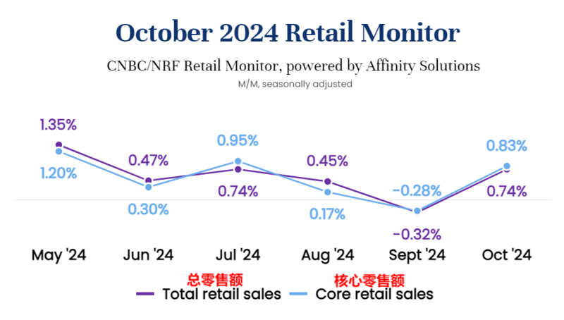 就目前的市場情況來看,旺季第一波流量應該是穩的。根據美國零售聯合會(NRF)發布的最新零售監測數據,今年10月份,美國零售額強勢反彈,環比增長0.74%,同比增長4.13%(未經季節性調整)。