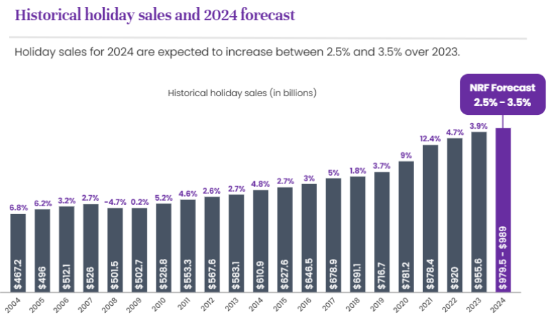 根據美國零售聯合會預測,相比2023年,今年的假日消費支出預計將增長2.5%至3.5%。也就是說,今年11月1日-12月31日期間,消費者總支出預計將維持在9795億美元-9890億美元間,而去年這一數字為9556億美元。