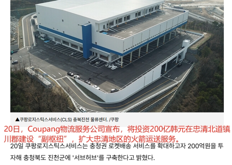 近日,Coupang物流子公司Coupang Logistics Service(CLS)宣布,將投資200億韓元在韓國忠清北道鎮川郡建設一座次級物流中心“副樞紐”(Sub Hub),以擴大忠清地區的火箭配送服務覆蓋范圍。