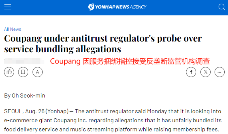 今年5月,Coupang因涉嫌違反《公平貿易法》和《分包法》受到韓國反壟斷監管機構(FTC)的調查,被指控對會員付費項目沒有盡到告知義務;今年6月,Coupang及其子公司CPLB因存在不正當貿易行為,被FTC處以1400億韓元的罰款;今年8月,FTC再次對Coupang進行調查,指控其在提高Wow會員費的同時,捆綁了食品配送服務Coupang Eats和音樂流媒體服務Coupang Play,這被認為是不公平的。