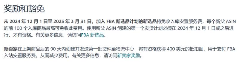 同時,亞馬遜還推出了一項激勵措施,在2024年12月1日-2025年3月31日期間,若賣家創建的商品新父ASIN符合FBA新選品計劃,亞馬遜將予以免除入庫安置服務費,但每個新父ASIN的前100個入庫商品不得超過此費用。
