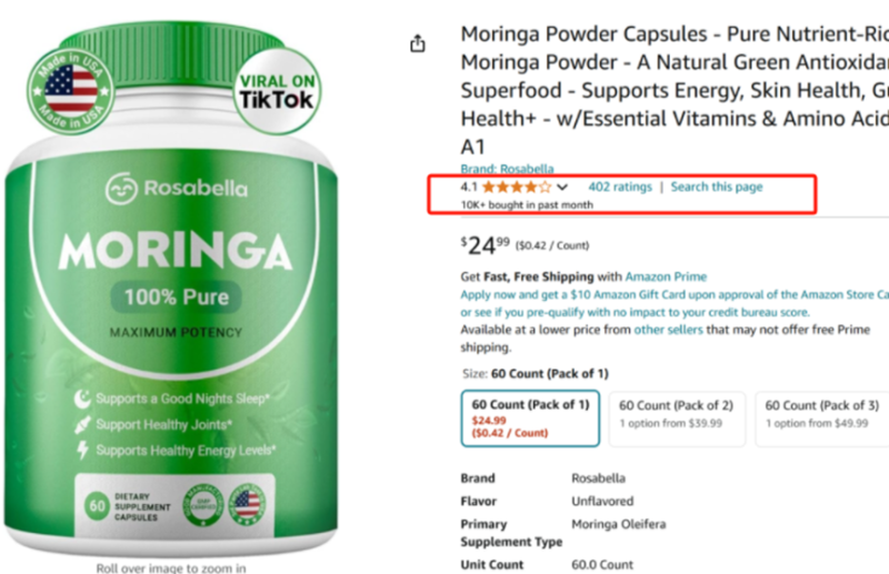 此外,除了TikTok Shop,亞馬遜也是Rosebella的重要銷售陣地。亞馬遜美國站數據顯示,在過去一個月中,Rosebella辣木膠囊通過亞馬遜平臺賣出了超1萬瓶,總評分達到4.1顆星。