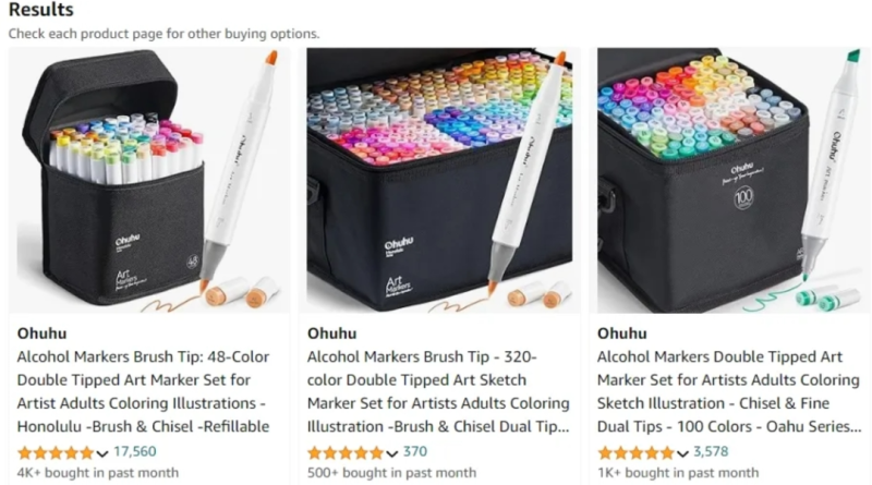 其次就是色彩豐富,馬克筆可以做出各種各樣的顏色,目前Ohuhu正在售賣的產品中就有120色、216色、320色等多種規格,再加上馬克筆幾乎很難自己調色,倘若想要擁有“全色系”,只能通過購買來實現。