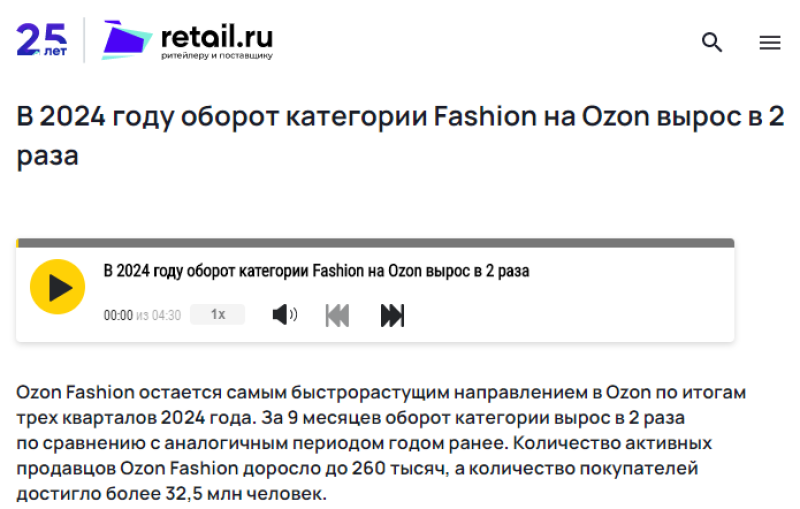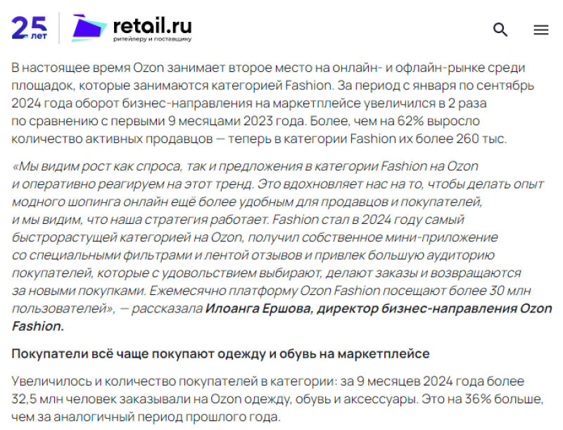 Ozon Fashion業務領域總監Iloanga Ershova表示:“2024年,時尚成為Ozon平臺上增長最快的類別,擁有自己的帶有特殊過濾器和評論源的迷你應用程序,并吸引了大量買家,他們樂于選擇、下訂單并退貨。每月有超過3000萬用戶訪問Ozon Fashion平臺。”
