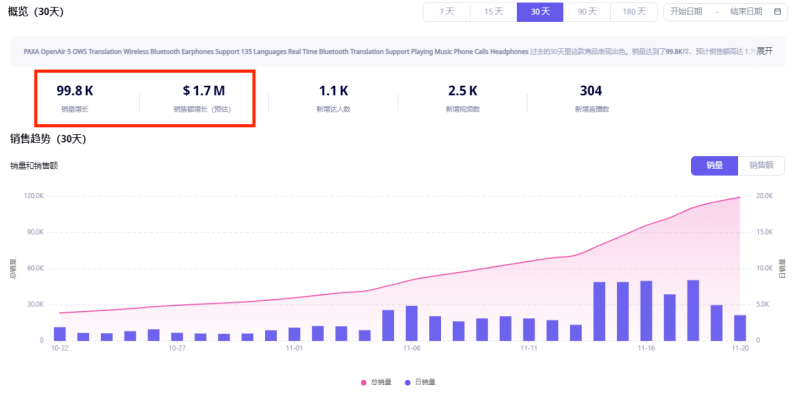 最近,一款翻譯耳機算是提前搶占了一波流量紅利,在TikTok美區火出了天際。Echotik數據顯示,最近30天內,這款耳機累計賣出9.98萬件,單日最高銷量突破8400件,預估總銷售額達170萬美金。