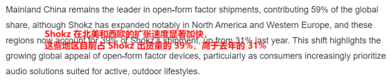 這一點從耳機出海品牌Shokz身上也能看出。Canalys數據顯示,去年,Shokz開放式設備在北美和西歐市場的出貨比例為31%,今年這個數字就已經上升至39%。