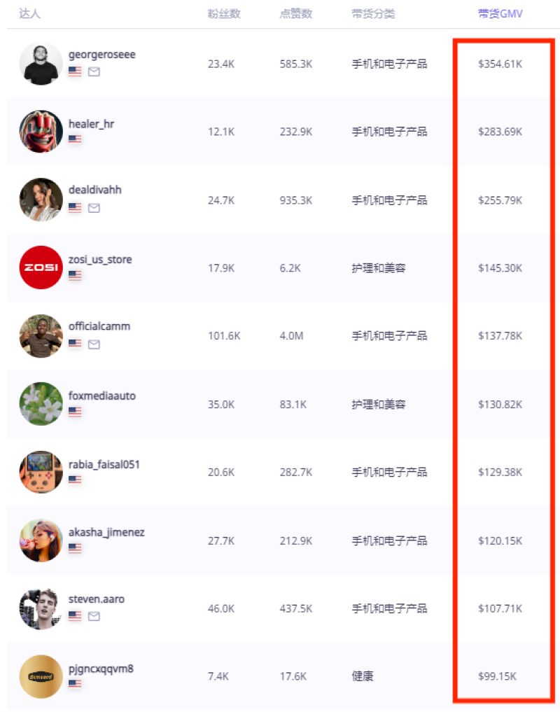 達人帶貨GMV榜 圖源:Echotik