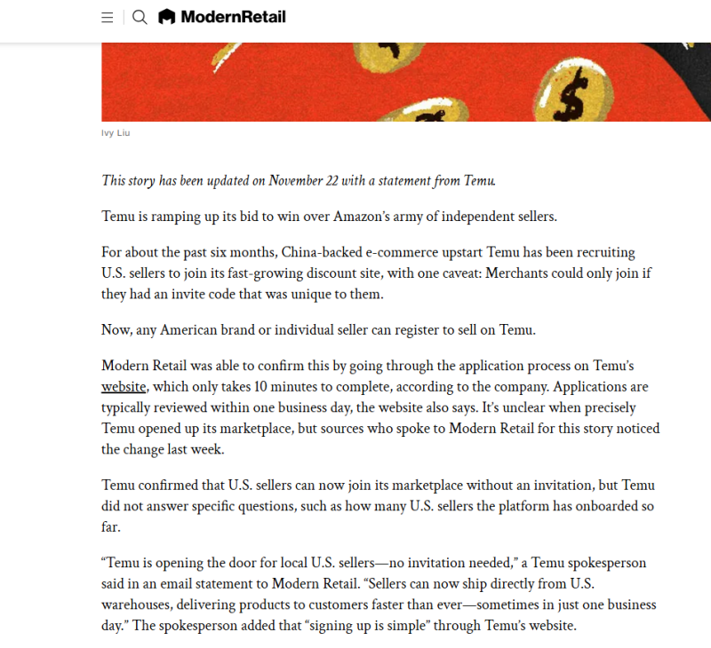TEMU發言人在給Modern Retail的電子郵件聲明中表示:“TEMU正在為美國本地賣家打開大門—無需邀請。賣家現在可以直接從美國倉庫發貨,以前所未有的速度將產品送到客戶手中—有時只需一個工作日。”發言人補充說,通過TEMU網站“注冊很簡單”。