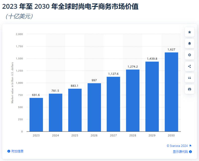 一份來自Statista的數據顯示,2024年,全球電商時尚行業的整體市場價值預計將達到7815億美元,到了明年,這一數字會增長到8831億美元。未來幾年,該市場還將持續增長,預計到2030年時,這一行業的價值預計會達到驚人的1.6萬億美元。屆時,全球時尚電商銷售額、消費者數量都會達到一個新高峰。