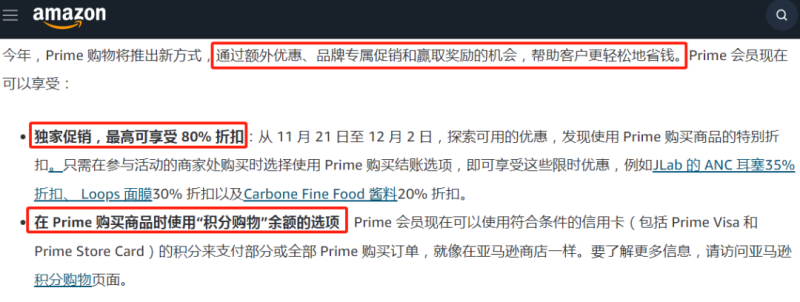 亞馬遜表示,今年的Prime會(huì)員將擁有更多獲得額外優(yōu)惠、贏取獎(jiǎng)勵(lì)、參加品牌專屬促銷的機(jī)會(huì)。具體來(lái)看,在11月21日至12月2日期間,Prime會(huì)員可享受獨(dú)家折扣,部分商品最高可享80%優(yōu)惠。與此同時(shí),Prime會(huì)員還可以使用“積分購(gòu)物”余額,使用符合條件的信用卡積分來(lái)支付訂單,提高購(gòu)物的靈活性。
