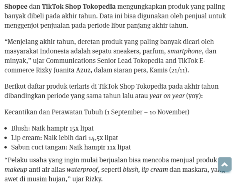 11月26日消息,隨著年末假日季臨近,Shopee和Shop Tokopedia公布了9-11月銷量最高的產(chǎn)品,為印度尼西亞賣家提供優(yōu)化銷售策略的參考。Tokopedia和TikTok電商通信高級負責人Rizky Juanita Azuz表示,Shop Tokopedia美容個護、食品飲料、時尚和家居品類在此期間表現(xiàn)強勁。在美容個護品類中,腮紅銷量增長近15倍,潤唇膏增長超過14.5倍,洗手液銷量上漲近11倍。Rizky建議賣家關(guān)注防水化妝品,如腮紅、唇霜和睫毛膏,以適應(yīng)雨季需求。