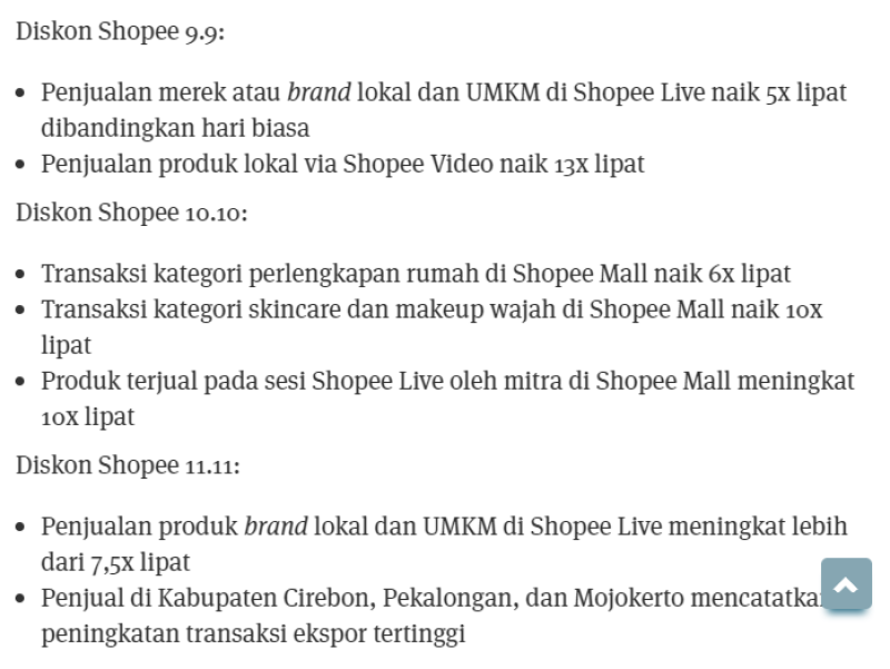 Shopee也分享了近期促銷中的關(guān)鍵暢銷產(chǎn)品和銷售趨勢。9.9活動中,本土品牌和中小微企業(yè)在Shopee Live上的銷售額增長5倍,Shopee Video本地產(chǎn)品銷售額增長13倍。10.10活動中,Shopee Mall家居設(shè)備交易量增長6倍,護膚和彩妝銷售額增長10倍,Shopee Live銷售產(chǎn)品增加10倍。11.11活動中,本地品牌和中小微企業(yè)產(chǎn)品在Shopee Live上的銷售額增長超7.5倍,井里汶、北加浪岸和莫佐克托縣的賣家出口交易增幅最高。