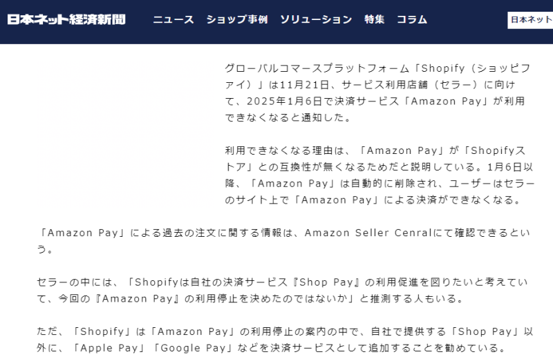 11月26日消息,Shopify近日通知其平臺上的日本商店(賣家),將于2025年1月6日結束提供支付服務“Amazon Pay”。自該日期起,Amazon Pay將不再與日本的Shopify商店兼容,相關功能將被自動移除,賣家將無法通過該支付方式結賬。