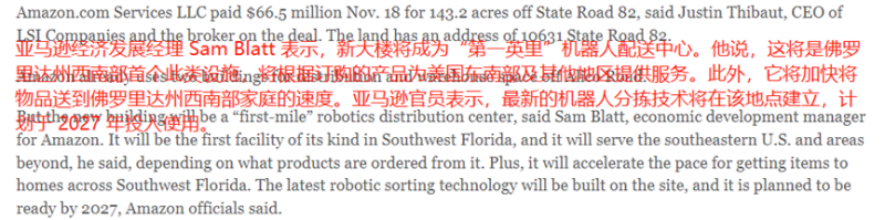 據了解,亞馬遜打算該配件中心建設成一個專注于“第一英里配送”的機器人配送中心,將為其引入許多自動化倉儲設備和人工智能設備。據亞馬遜表示,這會是它在佛羅里達州西南部的首個第一英里機器人配送中心,預計將在2027年正式投入使用。屆時,亞馬遜將能夠為美國東南部及其他地區的消費者提供服務,此外還將加快在佛羅里達州西南部地區的商品配送速度。