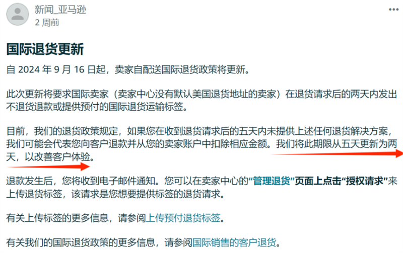 今年9月,為了優化消費者的退貨體驗,亞馬遜更新了賣家自配送的國際退貨政策,將退貨處理期限從5天縮短至2天。根據新規定,如果賣家收到了消費者的退貨申請,那么必須要在兩天內給出退貨解決方案。如果一直拖著不處理,那么平臺就會直接從賣家賬戶中扣除相應金額,補償給消費者。