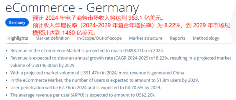 一份來自Statista的數據顯示,2024年,德國電商市場規模將達到983億美元,到了明年,這一數字會增長到1110億美元。未來幾年,這一市場還將持續增長,預計復合年增長率為8.22%。到2029年時,德國電商市場的規模將有望達到1460億美元,用戶數量將達到5180萬,電商用戶滲透率也將從2024年的62.7%增長到70.6%。