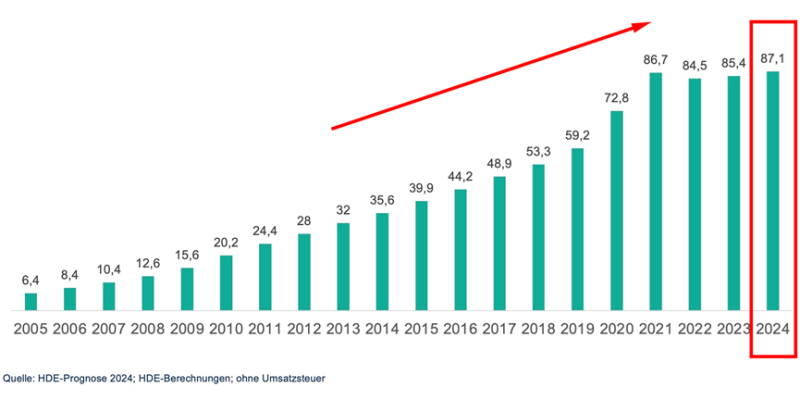 根據德國貿易協會HDE提供的數據,2024年,德國電商銷售額預計將會達到871億歐元(約合916.6億美元),相較上一年的854億歐元小幅增長大約2%。同時,這也將超越2021年達到的867億歐元高峰,創下德國在線零售市場的新紀錄。