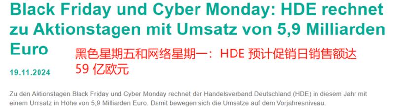 另外值得一提的是,今年德國假日購物季的銷售額也將有小幅增長。德國貿易協會(HDE)預計,2024年黑色星期五(11月29日)和網絡星期一(12月2日)大促銷售額將達到59億歐元。對此,HDE 副總經理Stephan Tromp 表示:“盡管消費者信心疲弱,但黑色星期五和網絡星期一期間的特別優惠繼續引起人們的極大興趣。”