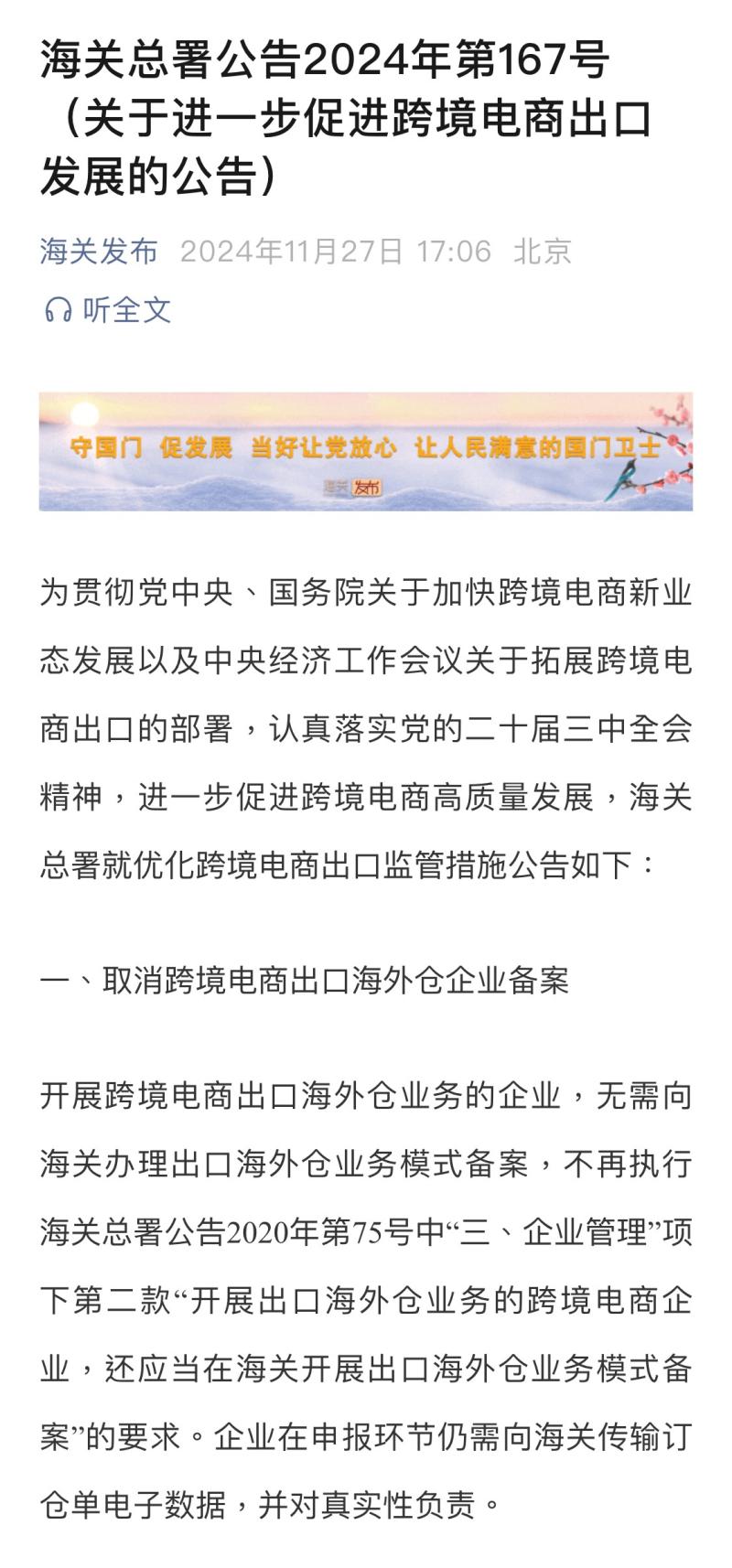 11月27日消息,海關(guān)總署發(fā)布關(guān)于進(jìn)一步促進(jìn)跨境電商出口發(fā)展的公告。其中,海關(guān)總署取消跨境電商出口海外倉(cāng)企業(yè)備案。開(kāi)展跨境電商出口海外倉(cāng)業(yè)務(wù)的企業(yè),無(wú)需向海關(guān)辦理出口海外倉(cāng)業(yè)務(wù)模式備案,不再執(zhí)行海關(guān)總署公告2020年第75號(hào)中“三、企業(yè)管理”項(xiàng)下第二款“開(kāi)展出口海外倉(cāng)業(yè)務(wù)的跨境電商企業(yè),還應(yīng)當(dāng)在海關(guān)開(kāi)展出口海外倉(cāng)業(yè)務(wù)模式備案”的要求。
