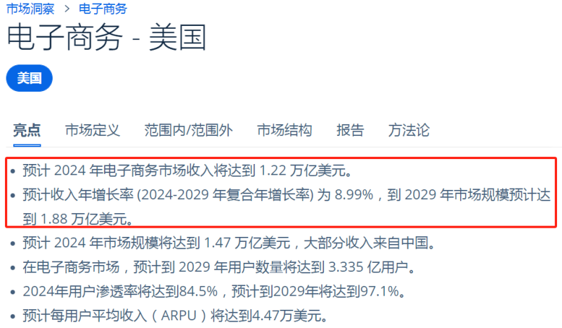 對于Temu來說,美國電商市場值得它重點押注。根據Statista發布的數據,2024年,美國電子商務市場收入將達到1.22萬億美元,這一數字到2029年或將飆升至1.88萬億美元,在這期間的復合年增長率為8.99%。可以說,美國電商市場是全球最為龐大的市場之一,面對如此巨大的掘金池,Temu如何能輕易錯過?