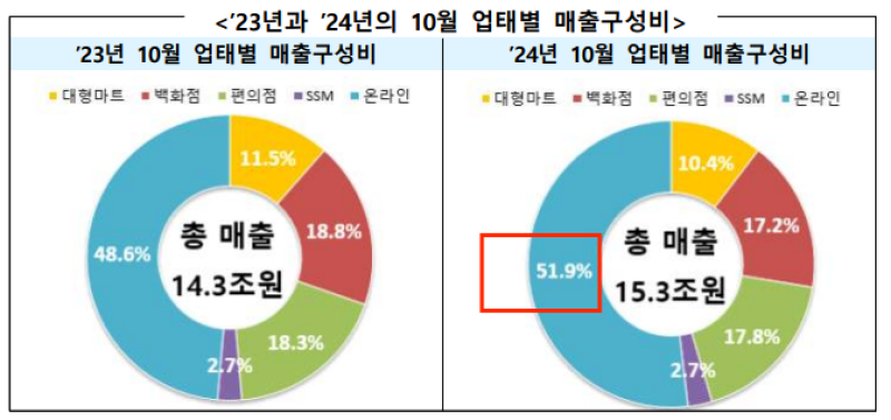 最近,韓國貿易、工業和能源部發布數據,今年10月份,韓國在線零售市場表現強勁,銷售額占比趕超線下,達到51.9%。這是自今年6月后,線上零售份額第二次超越線下零售。