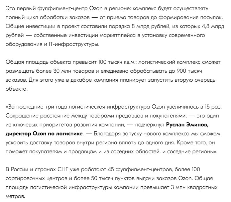 該項目總投資約為80億盧布,其中48億盧布用于安裝現(xiàn)代化設(shè)備和IT基礎(chǔ)設(shè)施。新設(shè)施的啟用將大大縮短貨物配送時間,推動Ozon在該地區(qū)的業(yè)務(wù)增長,并創(chuàng)造超過1500個就業(yè)崗位。