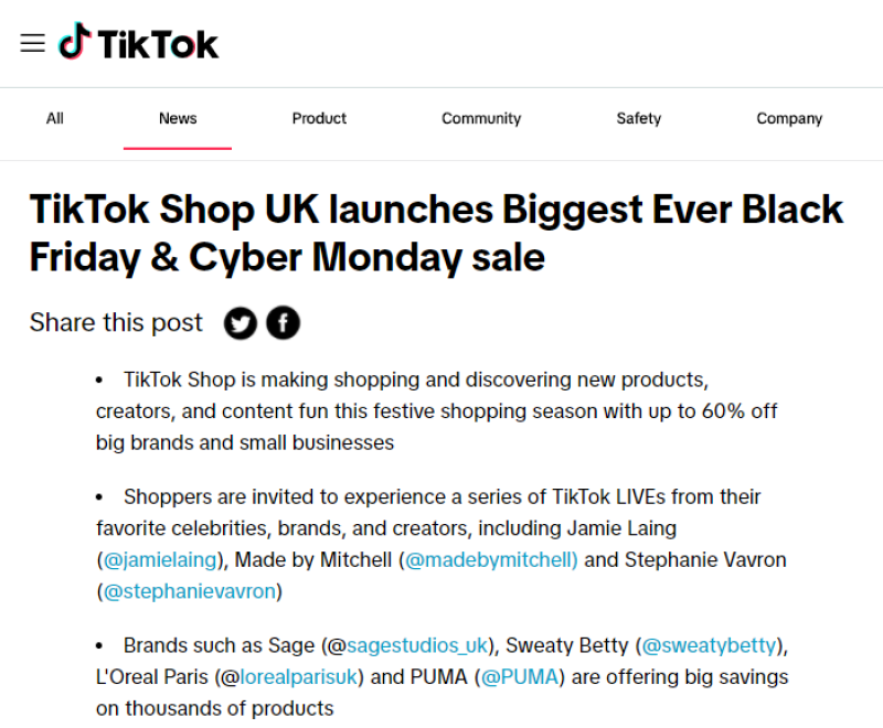 今年的黑色星期五促銷活動將以直播購物為主打,TikTok計劃通過該方式吸引更多消費者參與到節日購物季中。除大品牌外,平臺還將支持中小企業在這一促銷季節中獲得更多曝光機會。TikTok Shop還將為購物者提供獨家套餐、特別折扣和幸運抽獎,并有機會贏得高價值商品。