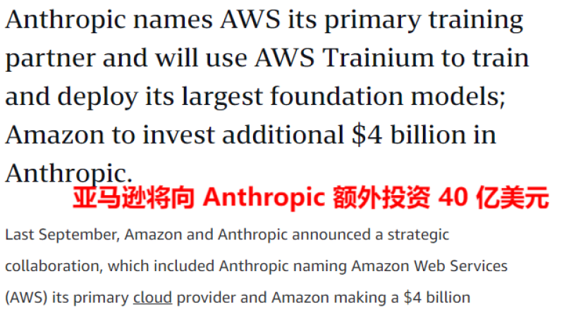 去年9月,亞馬遜和 Anthropic宣布了一項(xiàng)戰(zhàn)略合作,亞馬遜向Anthropic投資40億美元,Anthropic將亞馬遜AWS指定為主要云提供商。今年11月,亞馬遜又向Anthropic額外投資40億美元,支持Anthropic使用AWS來訓(xùn)練基礎(chǔ)模型,Anthropic則將亞馬遜指定為主要培訓(xùn)合作伙伴。