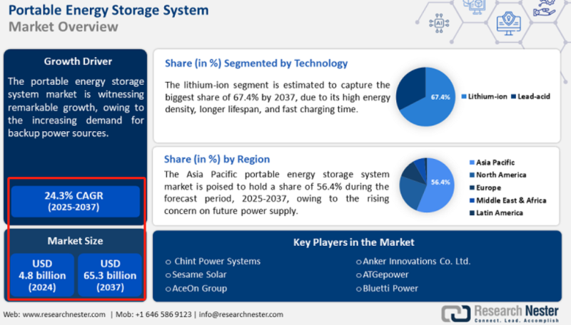 為什么是便攜及戶用儲能領域?對于這個選擇,安克創新有著自己的獨特考量。一方面,便攜及戶用儲能領域市場前景廣闊,來自ResearchNester的數據顯示,2024年便攜式儲能系統市場規模超過48億美元,這一數字到2037年將飆升至653億美元,預測期內的復合年增長率為24.3%。