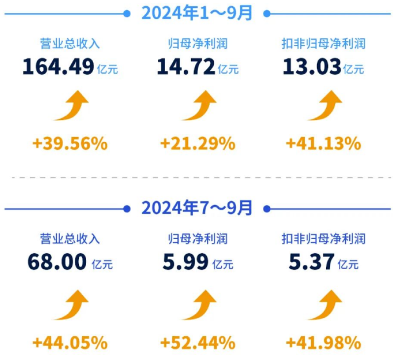 值得一提的是,在公司業績方面,安克創新更是保持了高速增長的態勢,營收和凈利潤雙雙呈現穩步上升的趨勢。2024年前三季度,公司實現營收164.49億元,同比增長近40%;凈利潤達到14.72億元,同比增長21.29%。