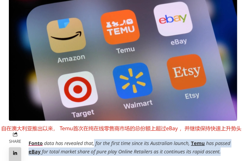 日前,F(xiàn)onto發(fā)布最新數(shù)據(jù)顯示,自Temu去年3月在澳大利亞推出以來,?在純?cè)诰€零售商市場(chǎng)的總份額上首次超過eBay。