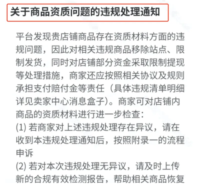 不久前,一些Temu賣家稱突然收到了平臺(tái)發(fā)出的資金受限通知:“平臺(tái)發(fā)現(xiàn)貴店鋪商品存在資質(zhì)材料方面的違規(guī)問題,因此對(duì)相關(guān)違規(guī)商品移除站點(diǎn)、限制發(fā)貨,同時(shí)對(duì)店鋪部分資金采取限制提現(xiàn)等處理措施。”