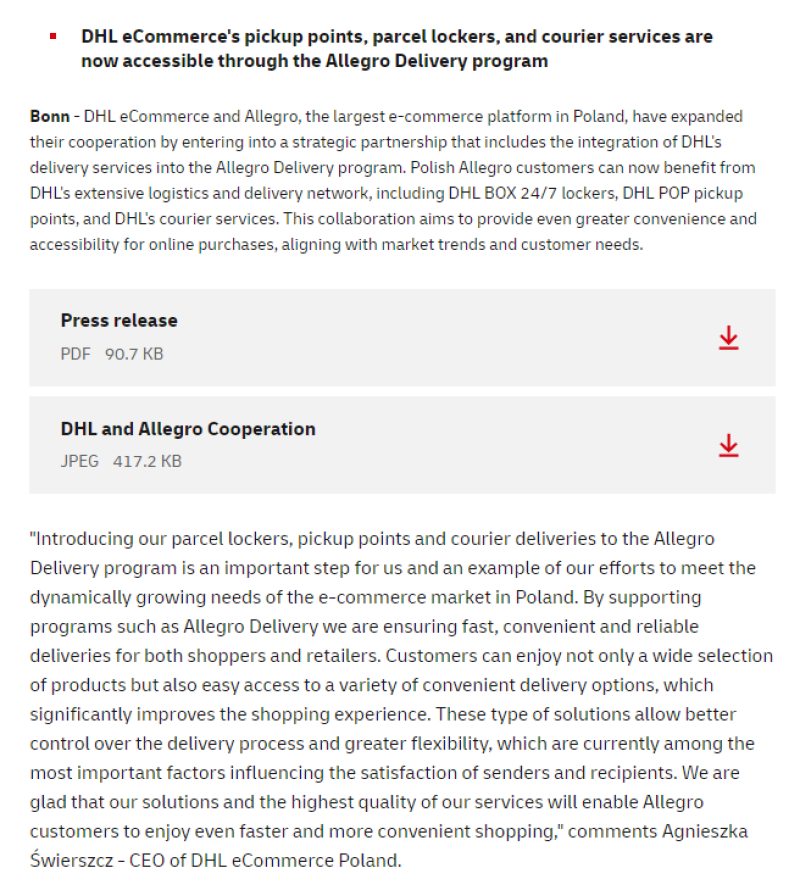 Allegro的Allegro Delivery計劃專注于為消費者提供多樣的配送選項,包括包裹自取點、提貨點或直接送貨上門。通過這一計劃,Allegro全程負責包裹的配送、退貨和投訴處理,并為整個送貨過程提供全方位服務。通過DHL的支持,波蘭的Allegro消費者將能夠享受到遍布全國的27,000個提貨點,進一步簡化購物體驗。