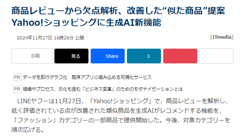 11月30日消息,雅虎購物近日宣布推出一項新功能,利用生成式AI根據消費者評論的內容推薦類似商品。這一功能旨在提升購物體驗,特別是在日本消費者進行商品對比時,為消費者提供更多有用信息。