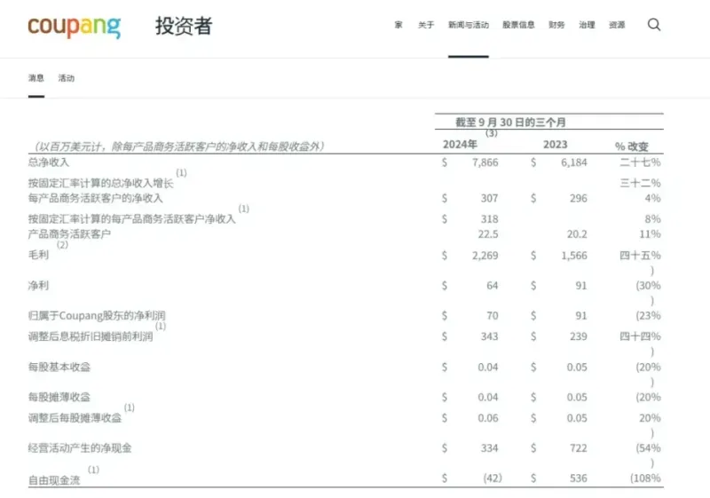 根據Coupang最新公布的財報,今年第三季度,Coupang營收79億美元,同比增長27%;凈利潤達到6400萬美元,成功從上一季度的虧損中實現扭虧為盈,同時銷售額也創下了歷史新高,是達到81.45億美元。